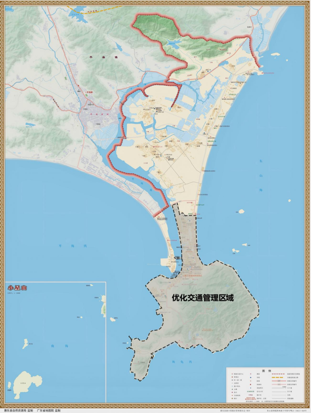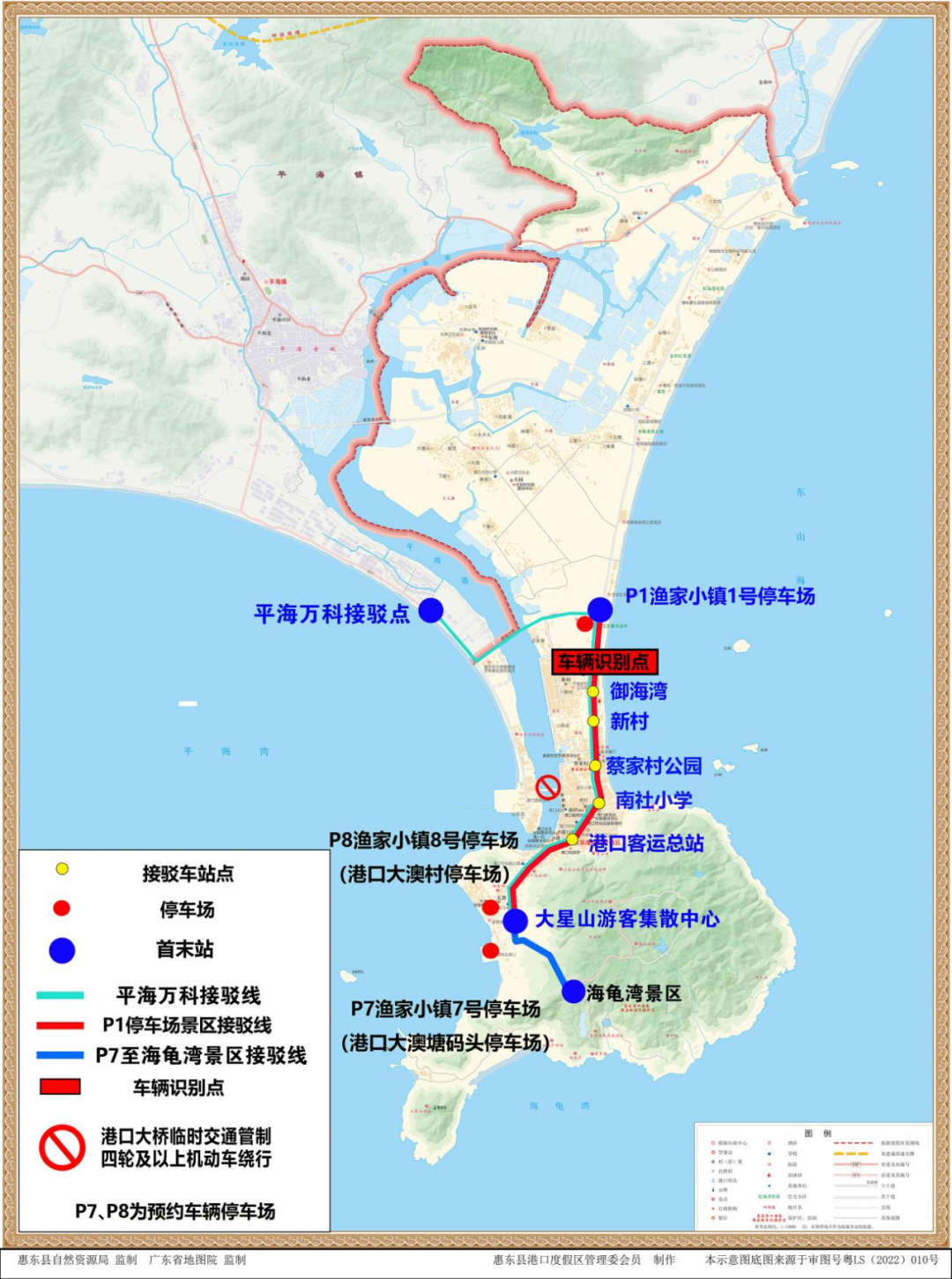惠东县港口度假区跨海大桥东侧桥头—新寮村—大星山—海龟湾(含港口大桥即港口老桥)的圩镇主干道及周边其他道路,为本次实施优化交通管理区域。